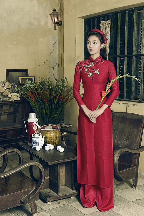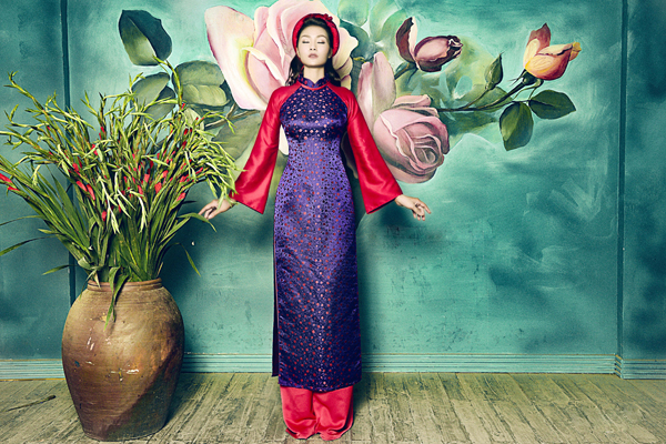 Ngoài cách chọn chất liệu sang trọng, những mẫu áo dài gấm trong bộ ảnh còn gây ấn tượng khi kết hợp với quần màu sắc nổi bật.
