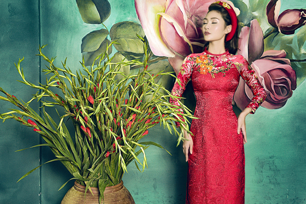 Thay vì những mẫu áo dài ren cầu kỳ, cô dâu có thể gây ấn tượng với quan khách trong ngày trọng đại bằng áo dài lụa cùng họa tiết hoa to bản độc đáo.