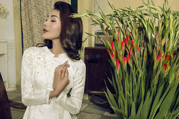 Bên cạnh màu đỏ truyền thống, áo dài màu trắng được các cô dâu lựa chọn nhiều trong ngày cưới. Chiếc áo dài lụa trắng mang vẻ đẹp thanh lịch, trang nhã, tôn lên đường cong cơ thể.