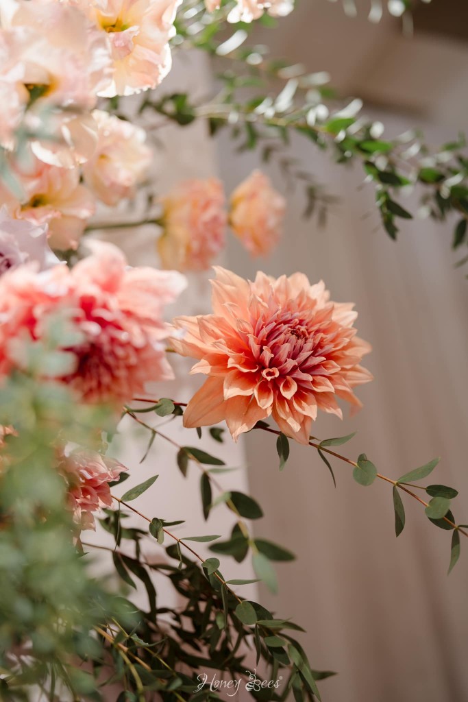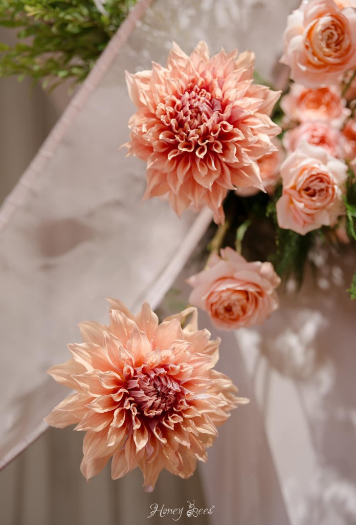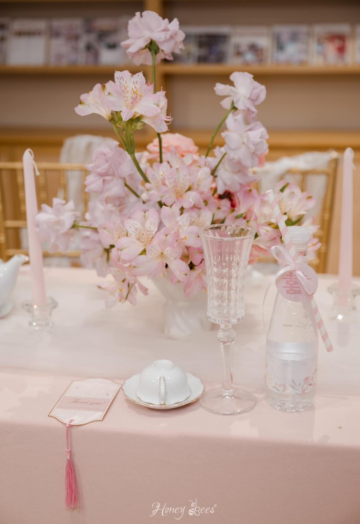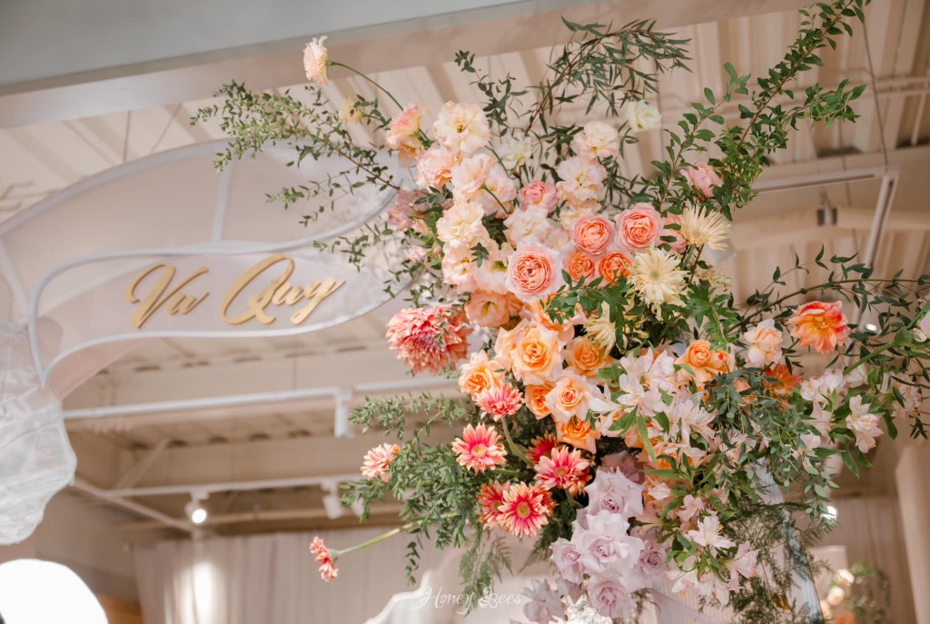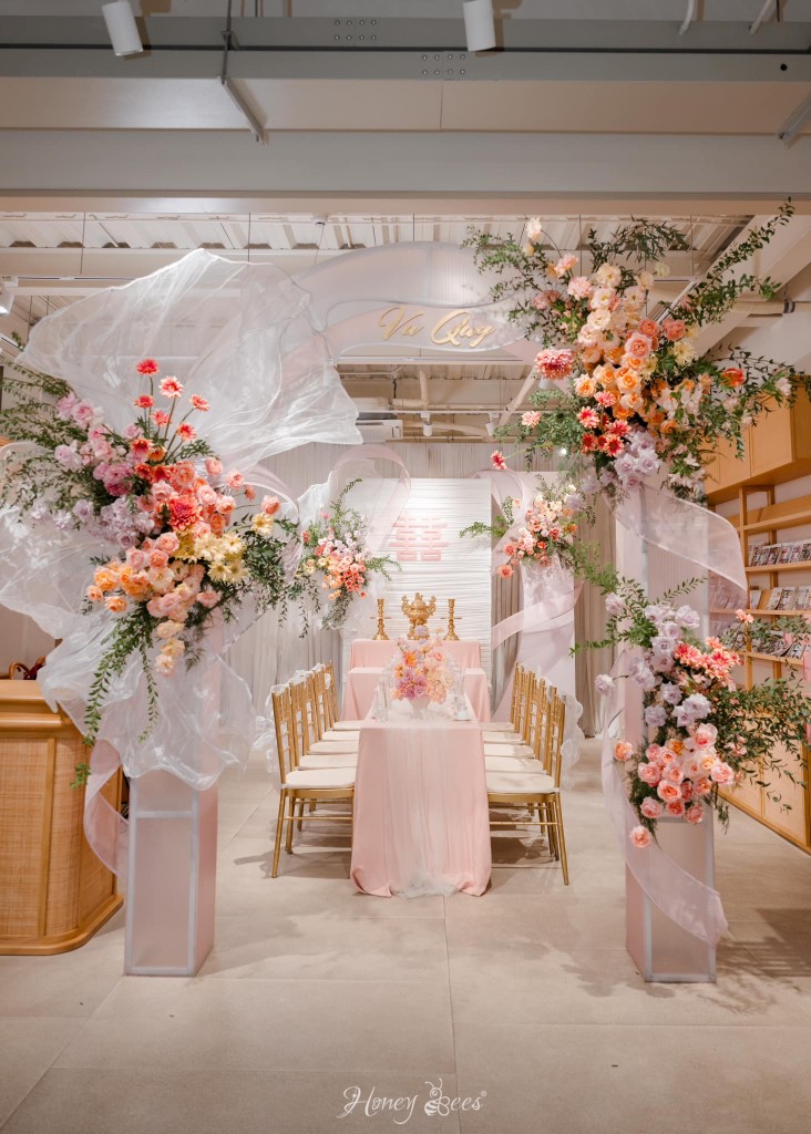 Bằng các tone màu quá đỗi thân quen trong các buổi Lễ Gia Tiên thường thấy ở Việt Nam - Hồng pastel và trắng, chúng mình đã ưu ái lựa chọn chất liệu vải nhúng để tạo hình thành các cánh hoa khổng lồ uốn lượn bồng bềnh như thể hiện cho một tình yêu to lớn và luôn tỏa sáng của cặp đôi. Đồng thời, chúng mình còn tô điểm thêm những cụm hoa mang tone màu pastel ở cổng hoa, backdrop cho đến bàn họ đã tạo nên một không gian tươi sáng và đầy sức sống hơn.