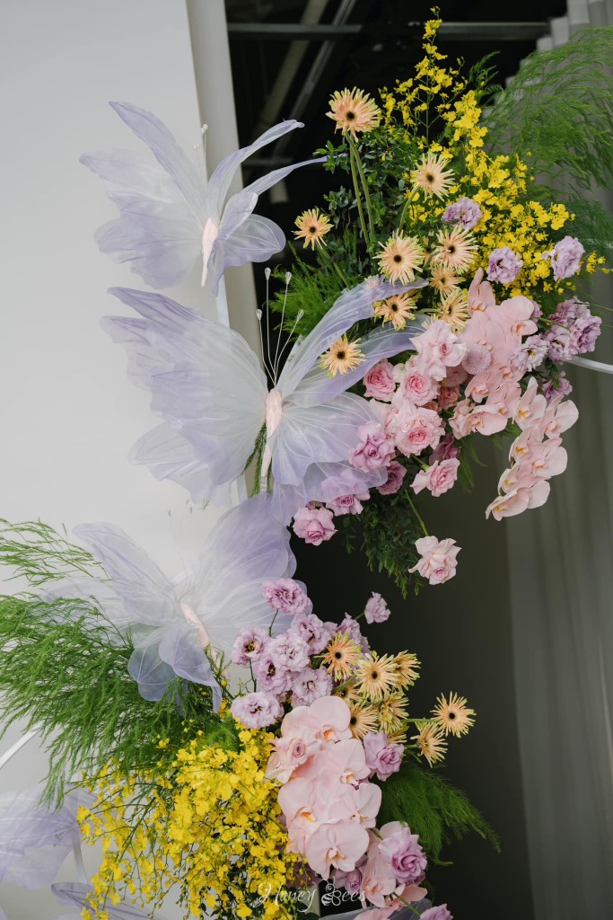 Sự kết hợp nhẹ nhàng từ những cánh hoa tone hồng - tím pastel, vàng … cùng hoạ tiết bướm 3D nổi được làm hoàn toàn bằng thủ công đã thật sự tạo nên sự khác biệt nhất định cũng như góp phần tạo ra một không gian cưới mang đậm tính thời thượng và sang trọng. Không những thế, với xu hướng cưới ngày nay thì những thiết kế đơn giản và tinh tế như “Dreamy Butterfly Wings” hứa hẹn sẽ luôn là sự lựa chọn hàng đầu của các cặp đôi theo đuổi chủ nghĩa duy mỹ.