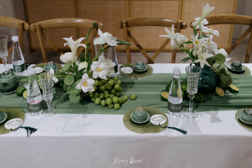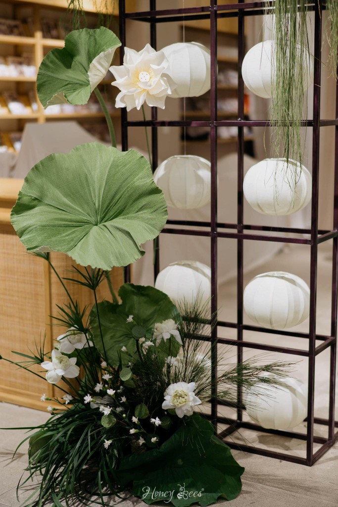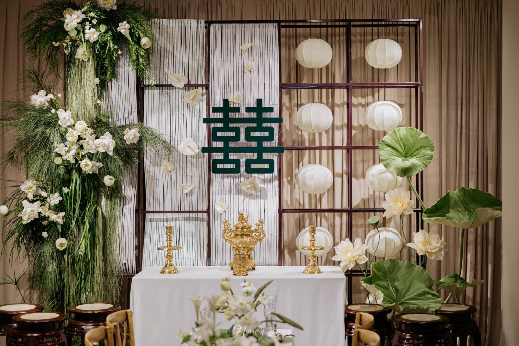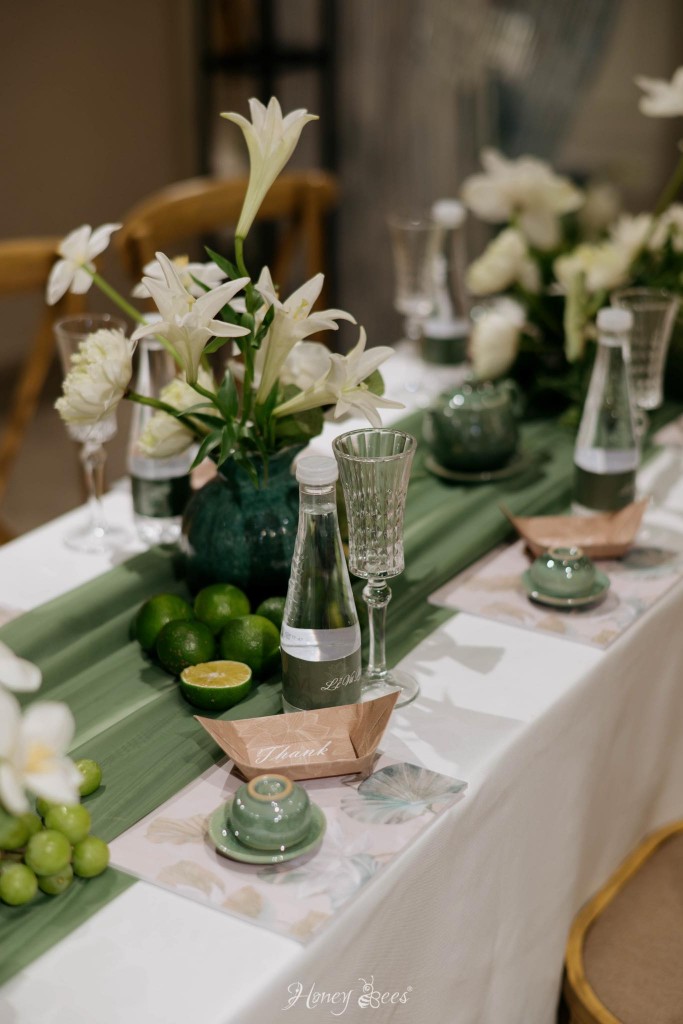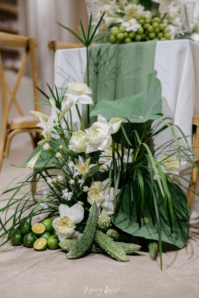 Thu hút những nàng dâu có niềm đam mê hoa sen bất tận, Honey Bees quyết định tạo ra một không gian mang âm hưởng từ nét đẹp Á Đông - mộc mạc mà trang nghiêm, tỉ mỉ nhưng vô cùng tinh tế. Ngoài ra, với ý nghĩa đặc biệt mà không loài hoa nào có được, ngoài sự biểu đạt của một tình yêu thuần khiết thì những cành sen tinh khôi còn tượng trưng cho sự vươn lên từ thử thách, là lời hứa hẹn vẹn tròn cho những ngày tháng mà đôi trẻ cùng nhau đi qua. Và đó chính là minh chứng rõ nét cho sự sáng tạo trong nghệ thuật thiết kế của Honey Bees về một không gian đầy ắp ý nghĩa về những giá trị văn hoá của quê hương, đất nước.
