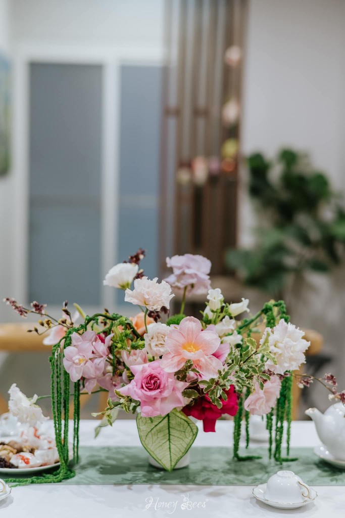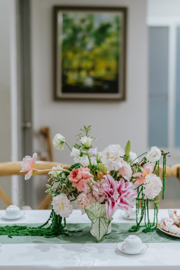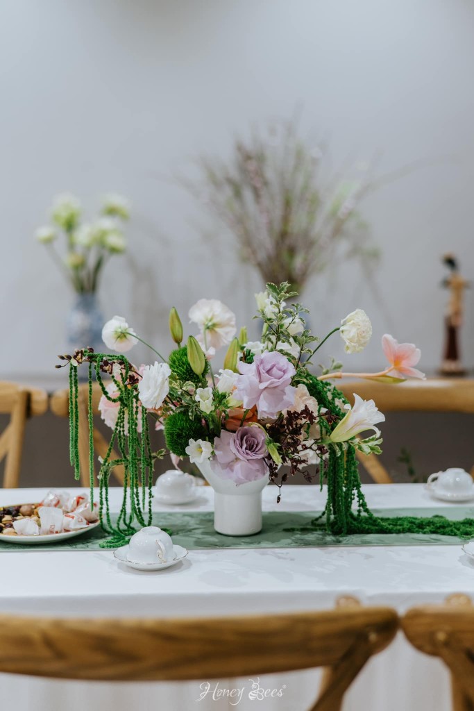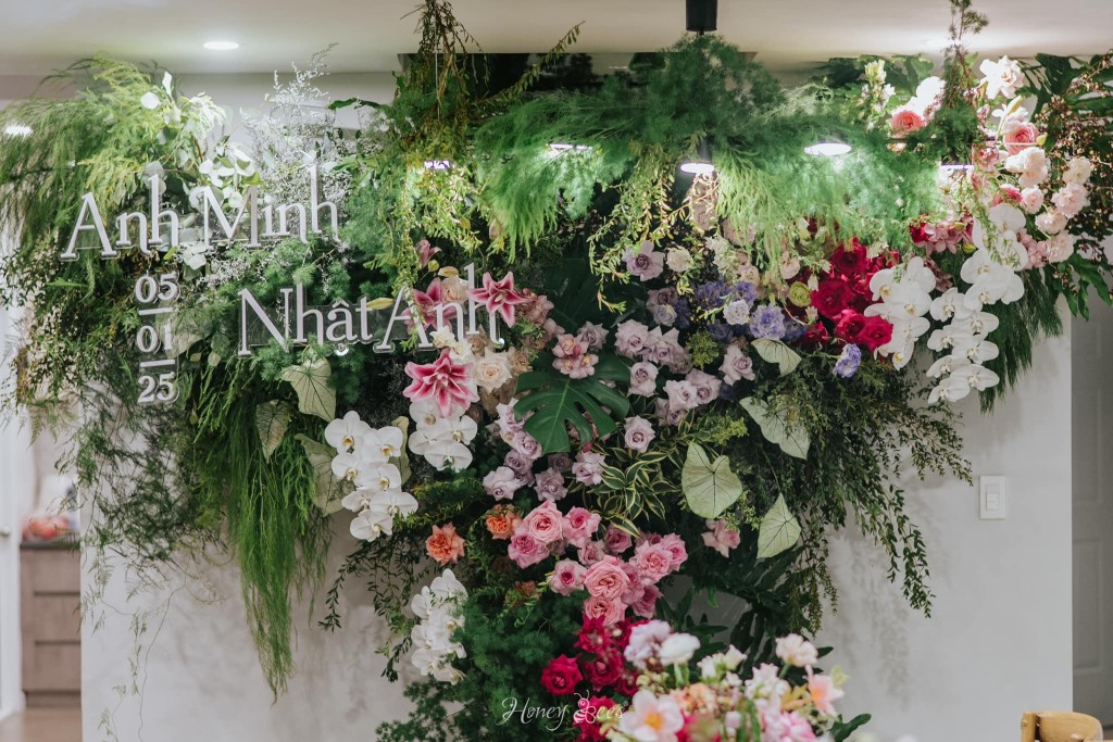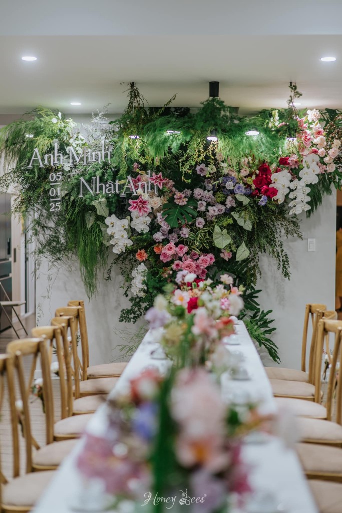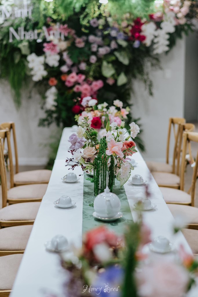 Anh Minh rất thích một buổi lễ gia tiên mang phong cách hiện đại, có nhiều hoa lá và cây cỏ, vậy nên một không gian thơ mộng và lãng mạn sẽ là sự lựa chọn đầu tiên của tụi mình dành cho buổi lễ này. Tổng quan buổi lễ trông như một khu vườn hoa ngập tràn sự ngọt ngào đúng như tình yêu của Anh Minh dành cho cô dâu của mình, ngoài ra concept còn là một lời nhắc nhở để cả hai cùng nhớ về chặng hành trình yêu ấy.