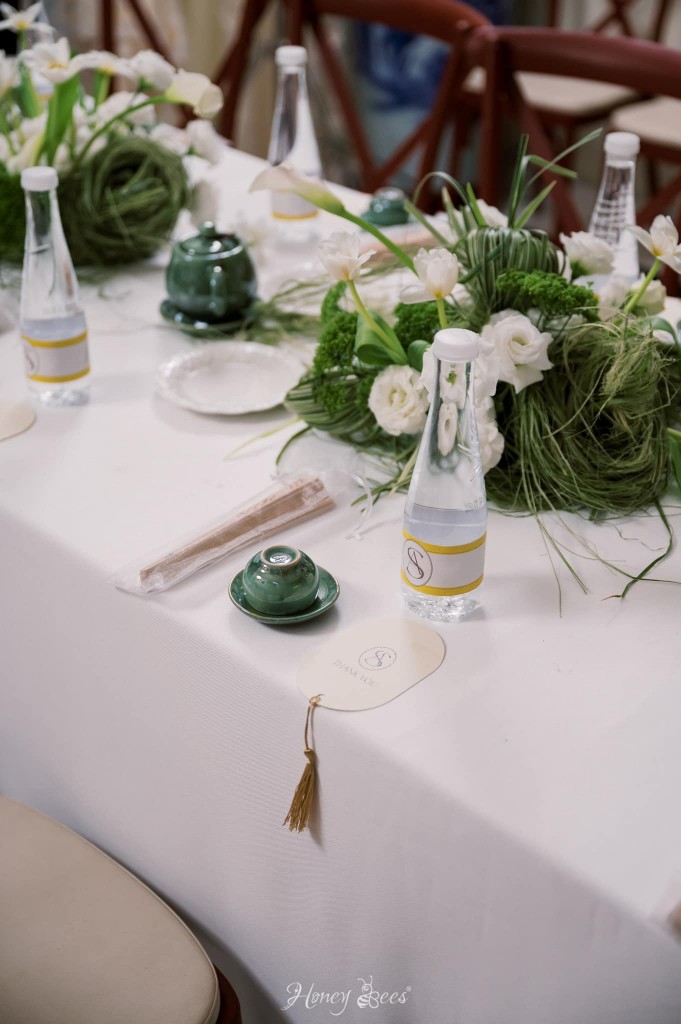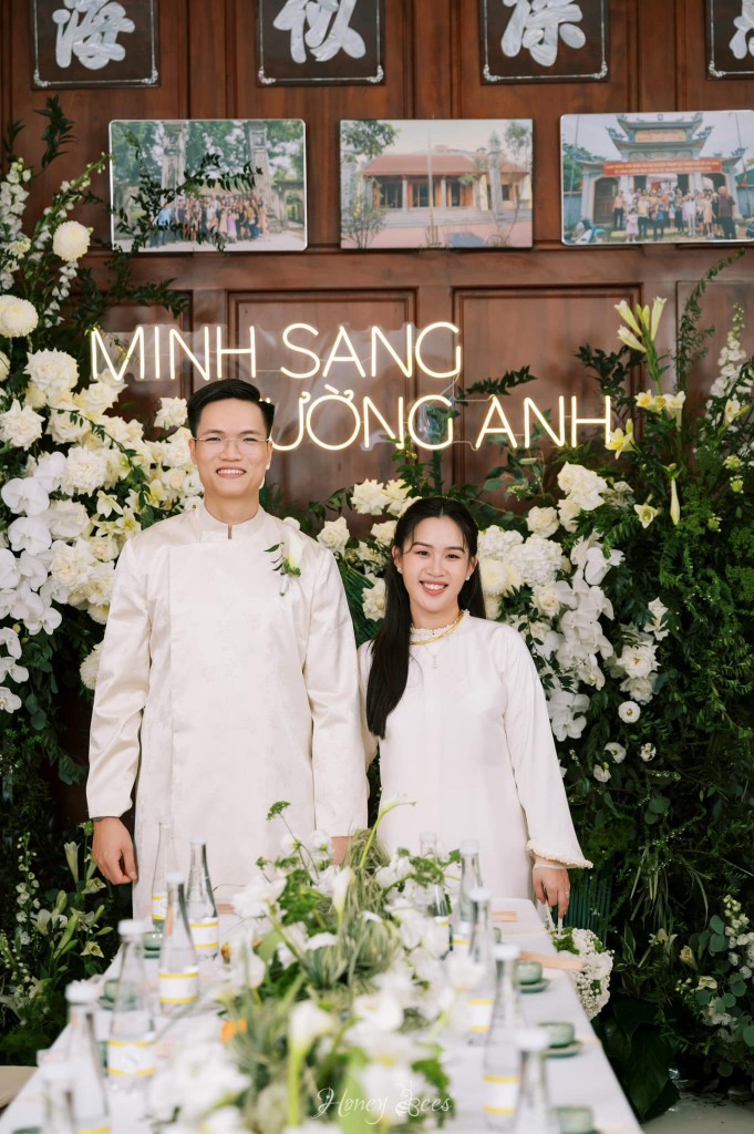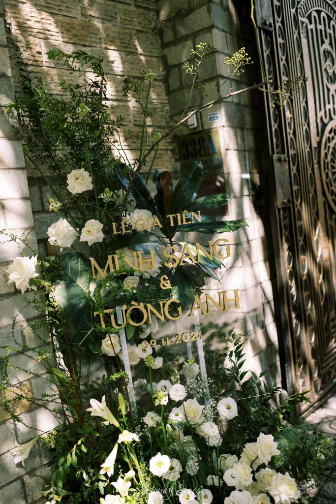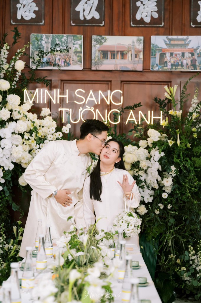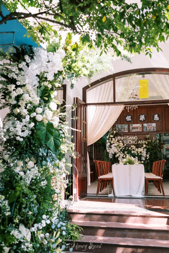 Chú rể Minh Sang chia sẻ rằng anh là người yêu thích sự đơn giản và tinh tế, vì thế mà buổi Lễ Tân Hôn của cặp đôi được Honey Bees tạo dựng như một bức hoạ của thiên nhiên. Chiếc backdrop được đan xen bởi những cụm hoa trắng và lá với nhau, điểm thêm dãy phên tre uốn lượn như tạo điểm nhấn giúp cho không gian tư gia nhà chú rể trở nên đặc biệt và ấn tượng hơn.