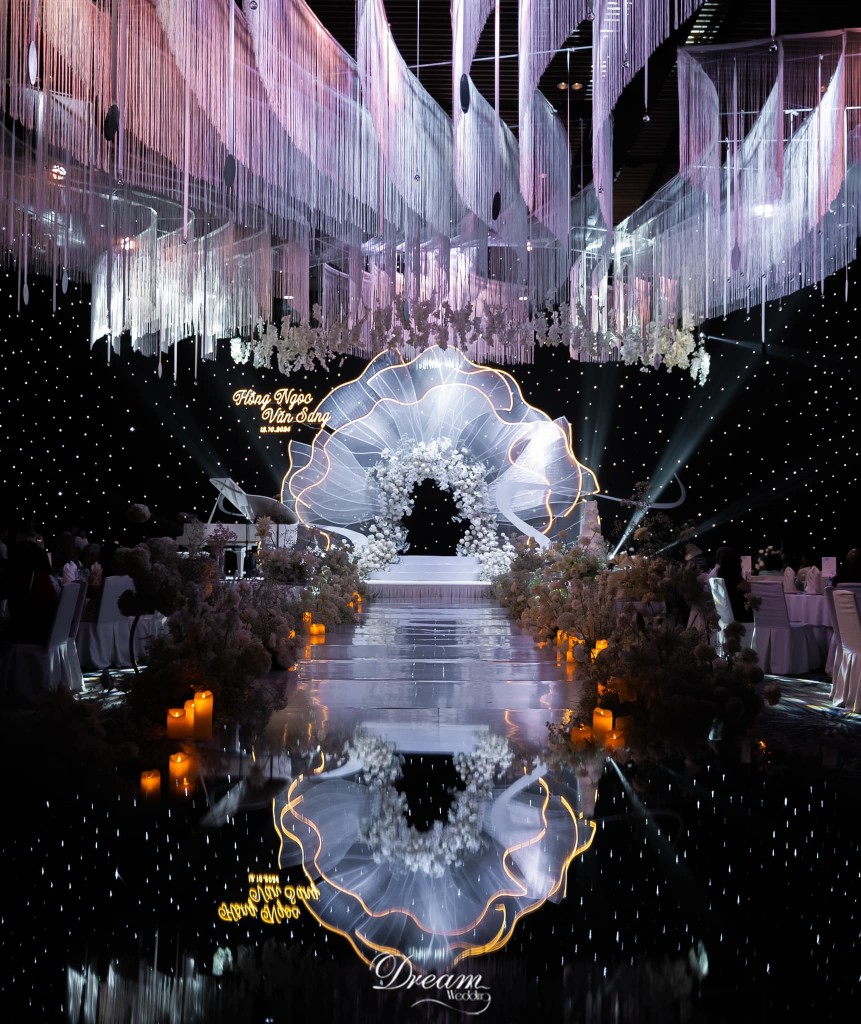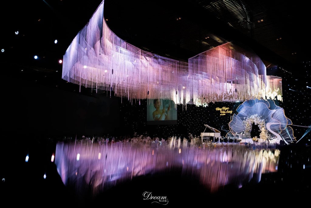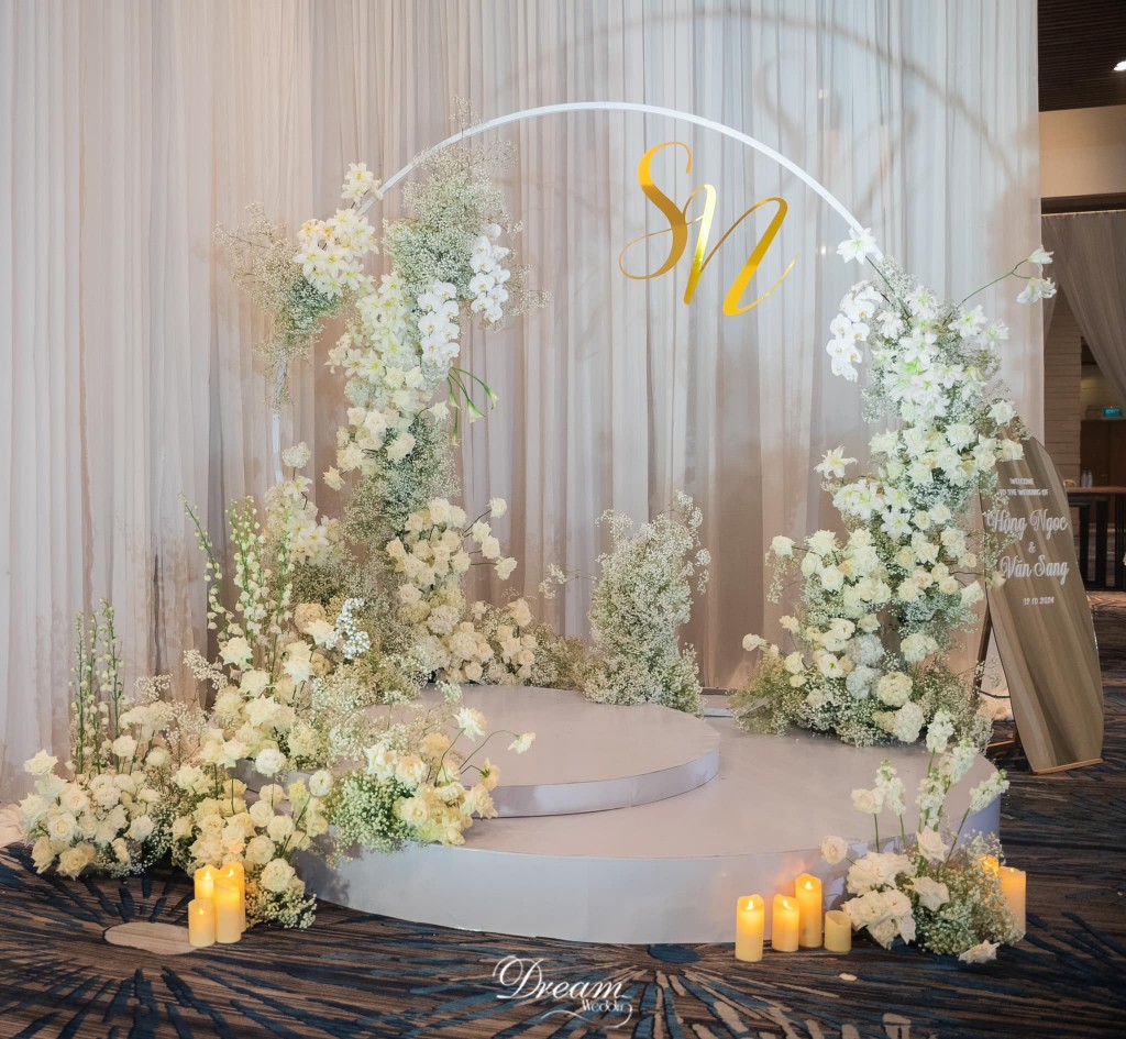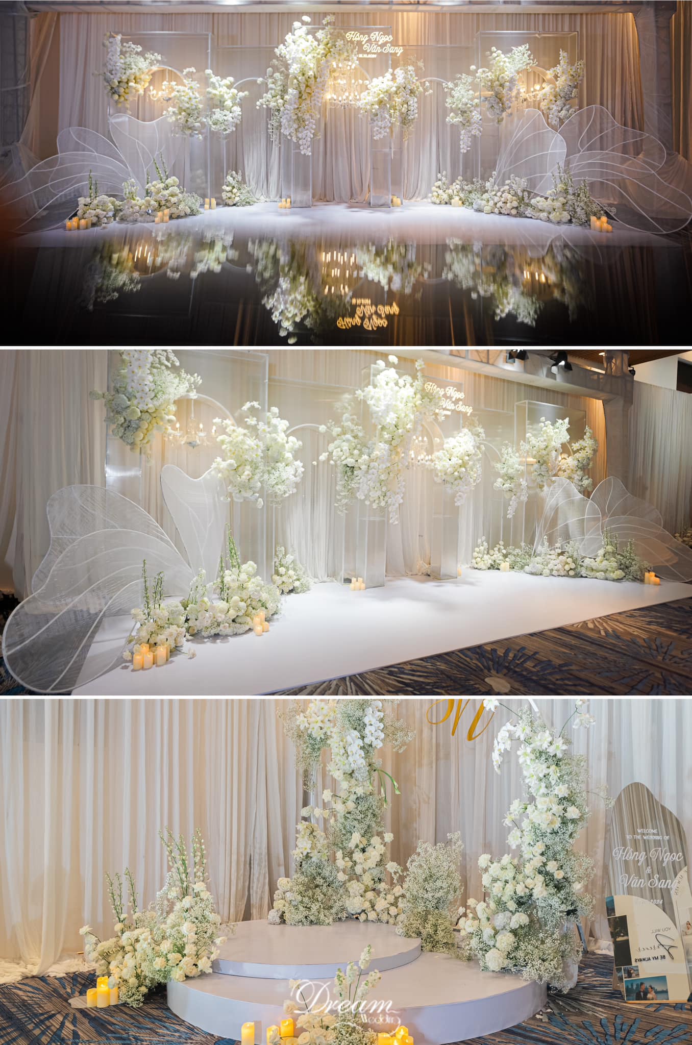 Mang trong mình những nét đẹp huyền bí được lấy cảm hứng từ sự mềm mại của cánh hoa, khu vực sân khấu được thiết kế ấn tượng với vòm hoa trắng tinh tế, nhấn nhá thêm là những cánh hoa vải phân tầng cao thấp xung quanh như tạo nên cánh cổng thần tiên đưa Ngọc & Sang cùng bước vào chuyến du hình tình yêu đầy cảm xúc của mình. Hơn hết, với sự góp mặt của những đoá hoa dường như đã “biến hoá” toàn bộ không gian của GEM Center trở nên kỳ ảo và thu hút hơn. Ở đó, không chỉ mang yếu tố về thị giác mà còn thay cho những lời chúc phúc của Dream Wedding gửi đến Ngọc & Sang với hy vọng rằng hành trình mới của hai bạn sẽ luôn hạnh phúc, rực rỡ như những đóa hoa lung linh mà Dream Wedding gửi gắm vào trong buổi tiệc.