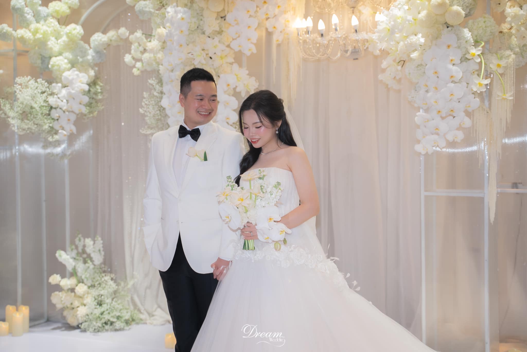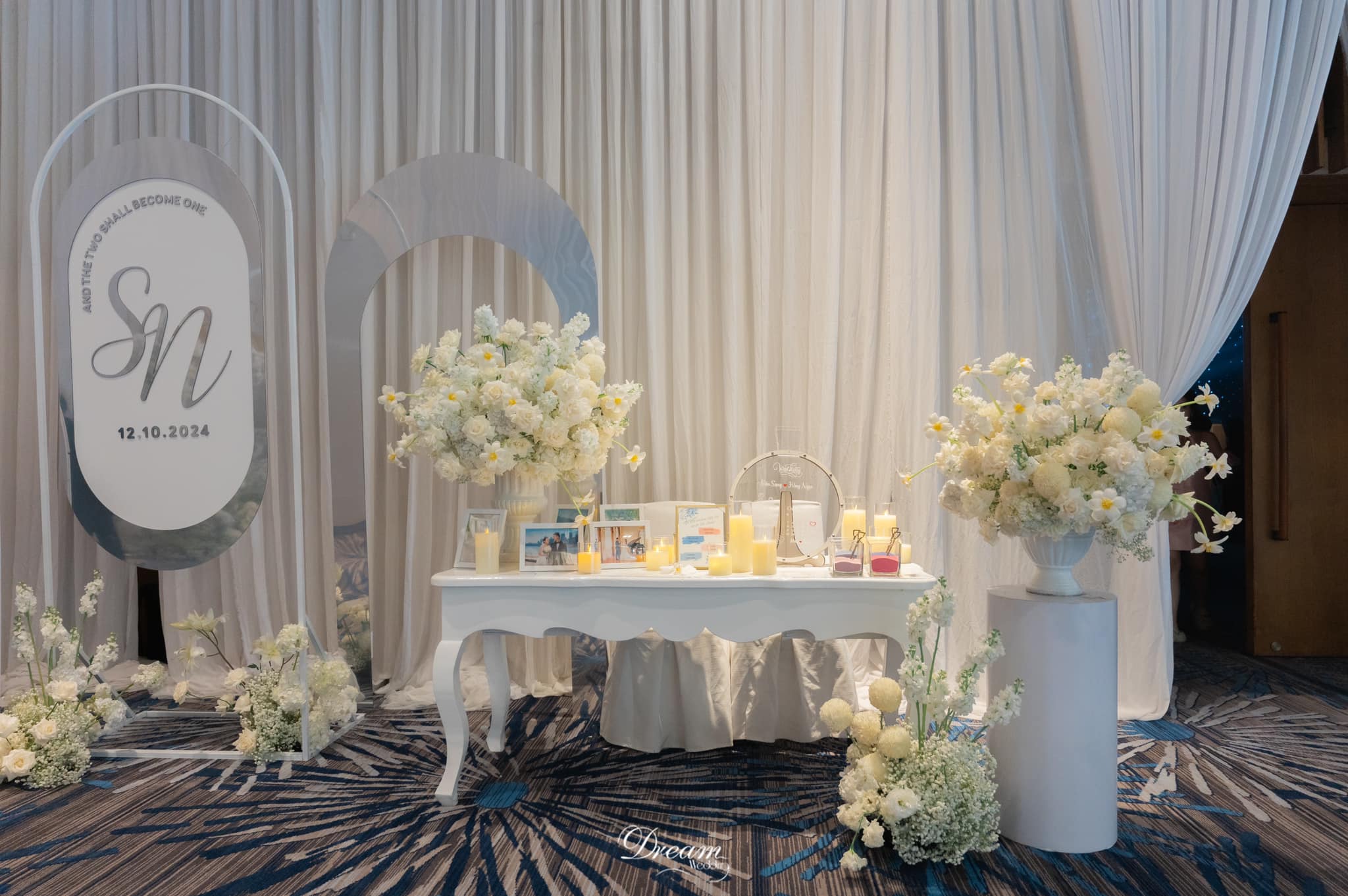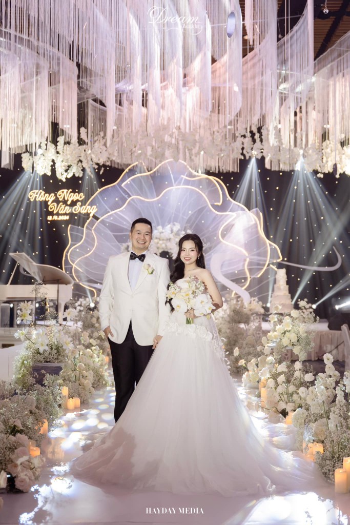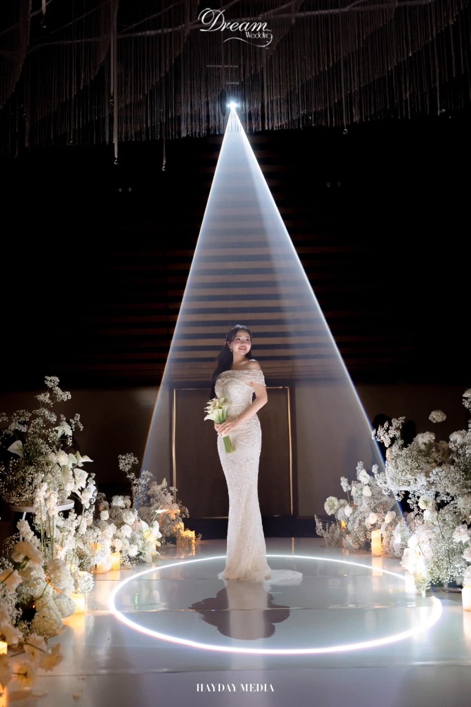 Mang trong mình những nét đẹp huyền bí được lấy cảm hứng từ sự mềm mại của cánh hoa, khu vực sân khấu được thiết kế ấn tượng với vòm hoa trắng tinh tế, nhấn nhá thêm là những cánh hoa vải phân tầng cao thấp xung quanh như tạo nên cánh cổng thần tiên đưa Ngọc & Sang cùng bước vào chuyến du hình tình yêu đầy cảm xúc của mình. Hơn hết, với sự góp mặt của những đoá hoa dường như đã “biến hoá” toàn bộ không gian của GEM Center trở nên kỳ ảo và thu hút hơn. Ở đó, không chỉ mang yếu tố về thị giác mà còn thay cho những lời chúc phúc của Dream Wedding gửi đến Ngọc & Sang với hy vọng rằng hành trình mới của hai bạn sẽ luôn hạnh phúc, rực rỡ như những đóa hoa lung linh mà Dream Wedding gửi gắm vào trong buổi tiệc.