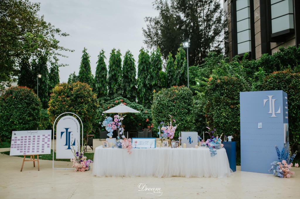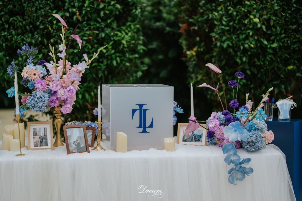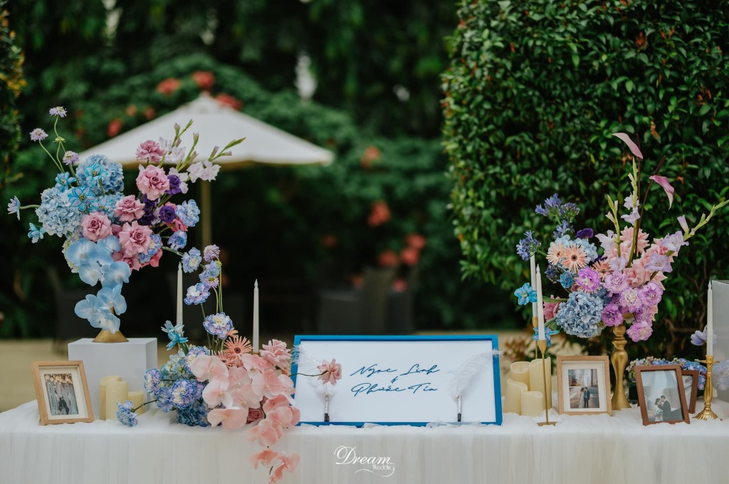 Ở concept này, Dream Wedding vẫn giữ nguyên chiếc bàn dài truyền thống cho khu vực ký tên, lồng ghép khéo léo những chi tiết lại với nhau để khách mời vừa có thể thưởng thức trọn vẹn vẻ đẹp của nghệ thuật sáng tạo từ Dream Wedding, nhưng lại vừa hiểu rõ hơn về câu chuyện tình yêu của Tín & Linh được truyền tải một cách tinh tế nhất qua các bức ảnh Pre - Wedding và các phụ kiện trang trí.
