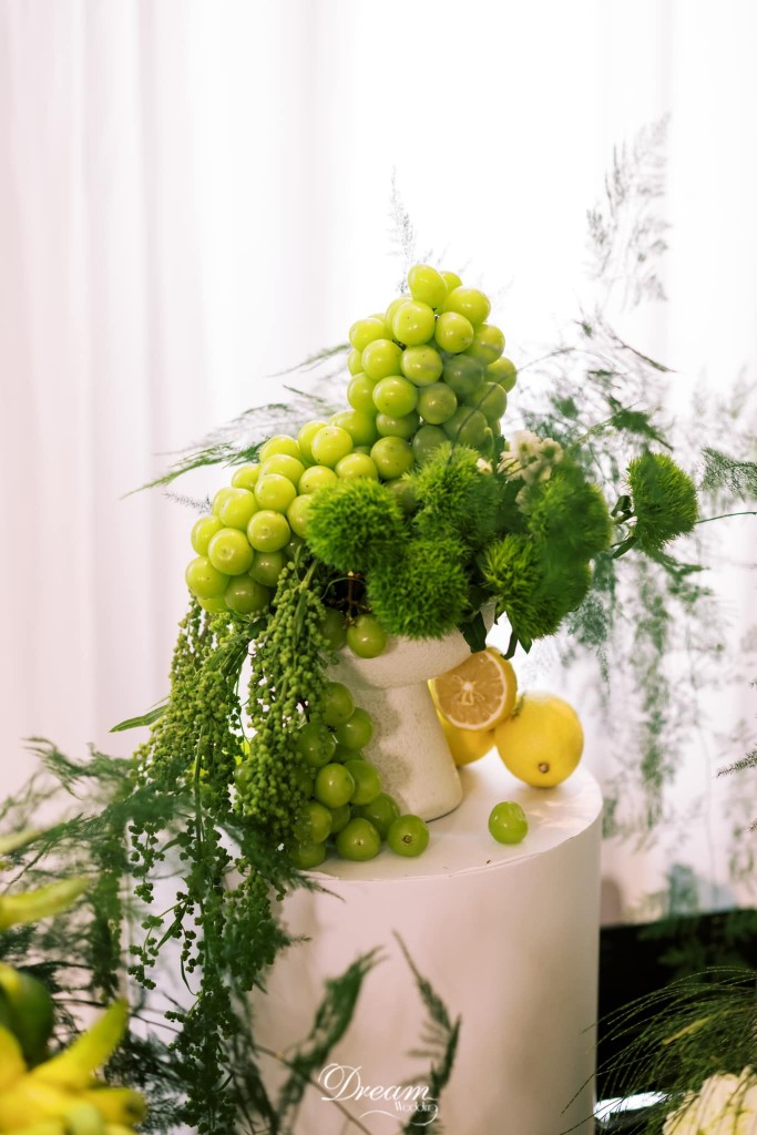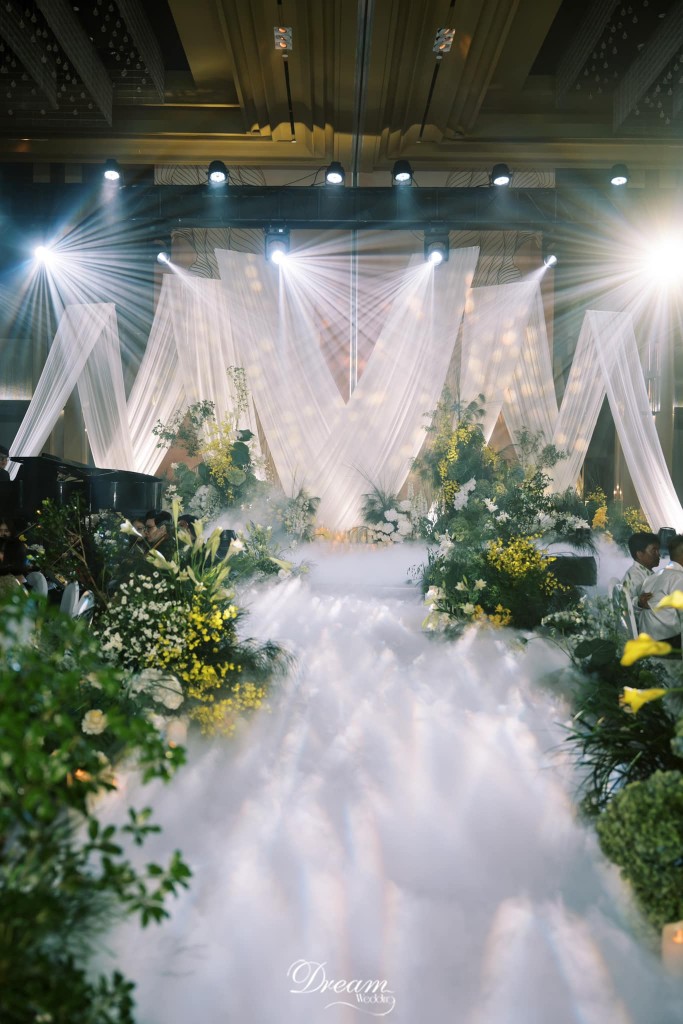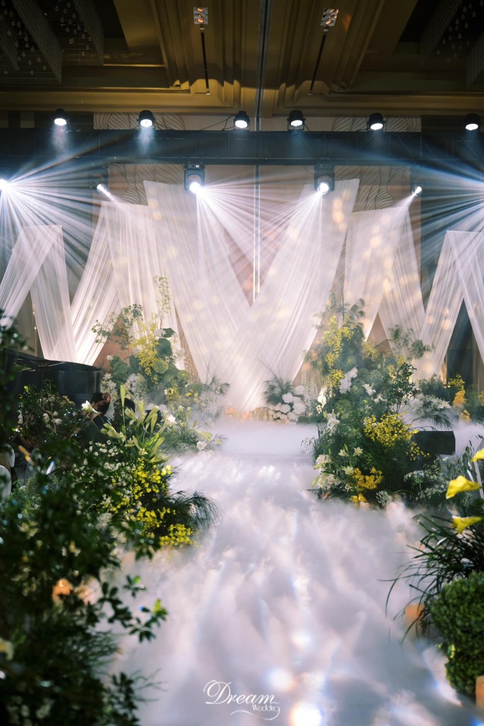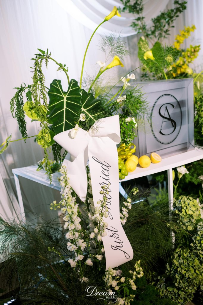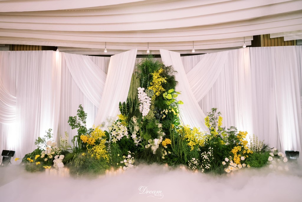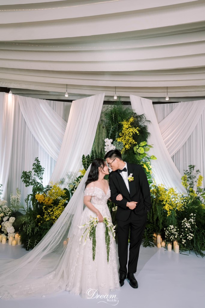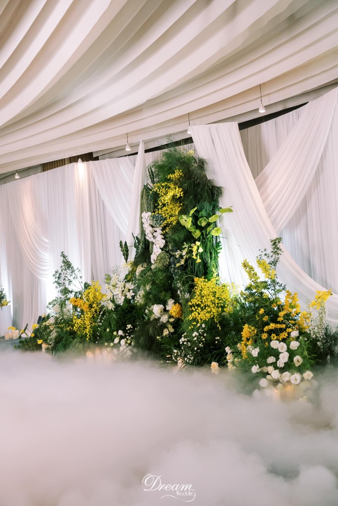 Với sự kết hợp hoàn hảo giữa các tone màu - Trắng, vàng, xanh lá cùng những ý tưởng mới lạ, khu vực chụp ảnh được thiết kế với chiếc màn voan trắng, xung quanh là những cụm hoa mang theme màu như đưa mọi người bước vào khu vườn thiên nhiên - Nơi tình yêu luôn được nuôi dưỡng và tỏa sáng, giống như những đóa hoa mà tụi mình lựa chọn cũng như đan cài tỉ mỉ trong Tropical Garden của cặp đôi.