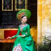 Việt Trinh rạng rỡ trong trang phục áo dài gấm trung niên
