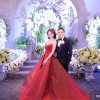 Cùng với váy cưới màu trắng, một bộ áo dài đỏ với phom dáng truyền thống, cổ cao, tay dài kín đáo sẽ là trang phục không thể thiếu giúp tôn nét duyên dáng, sang trọng của cô dâu.