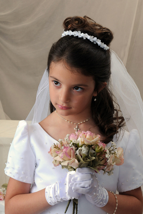 Bạn cũng có thể làm điệu cho phù dâu nhí bằng kiểu tóc búi nửa đi kèm khăn voan.