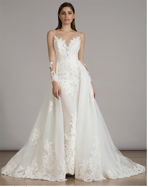 Với thao tác tháo rời chân váy, cô dâu có thể nhanh chóng biến đổi từ váy dài thướt tha sang jumpsuit bó sát.