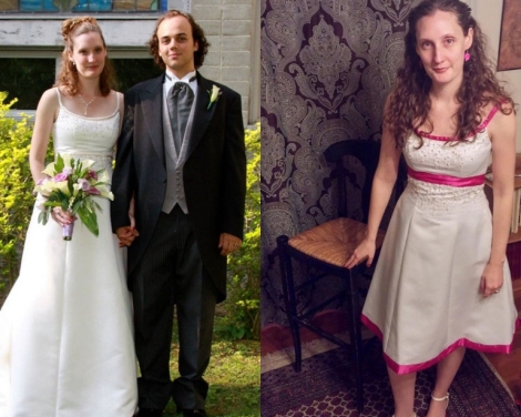 Bộ váy cưới "lột xác" sau khi được cắt ngắn và nhuộm quai váy màu hồng. Mẫu váy mới này phù hợp với những bữa tiệc cưới, tiệc cocktail ngoài trời.