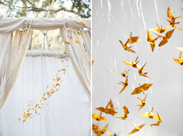 Chiếc rèm làm từ bầy hạc giấy khiến không gian tiệc cưới trở nên thơ mộng hơn.