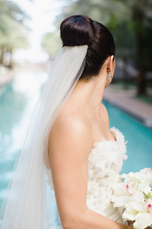 Cùng kiểu tóc búi tinh tế, cô dâu sẽ giữ được nét cổ điển, hài hòa với trang phục cưới. Chuyên gia làm tóc cố định tóc gọn gàng ở phía sau rồi dùng ghim để cài khăn voan lên đỉnh.
