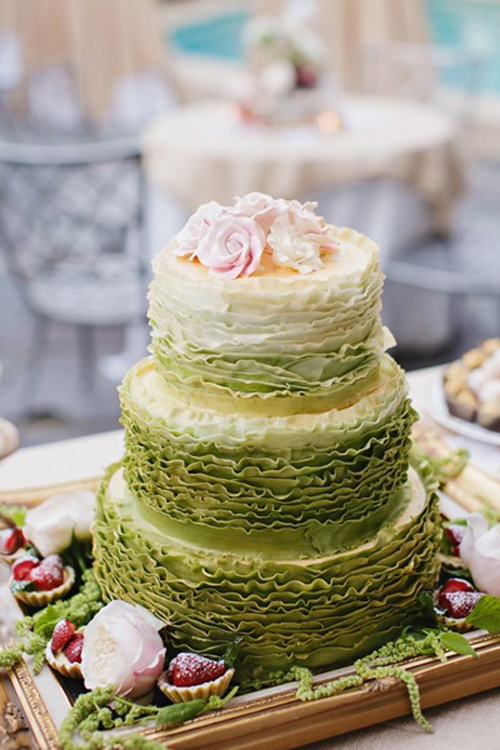 Bánh cưới với những chi tiết bèo nhún mềm mại sẽ trở thành điểm nhấn đặc biệt trong ngày trọng đại.