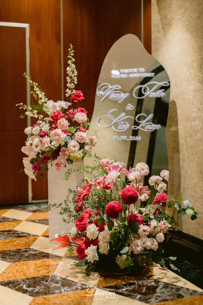 Vì đã cùng nhau trải qua những thăng trầm trong cuộc sống, tổ ấm nhỏ của anh chị ngày càng ấm áp hơn và giờ đây, anh chị mong muốn tổ chức một chiếc tiệc kỷ niệm cùng với những người thân yêu bằng một không gian của sự ngọt ngào được lấy từ các sắc thái của gam màu hồng, tô điểm tinh tế thêm các nhành hoa trắng muốt của linh lan, cẩm tú cầu, hồng nhập khẩu, lan hồ điệp … như truyền tải về sự nhẹ nhàng, trân trọng của anh chị trong cách “giữ lửa” hôn nhân để luôn luôn có một tình yêu bền vững như thế trong 22 năm bên nhau.