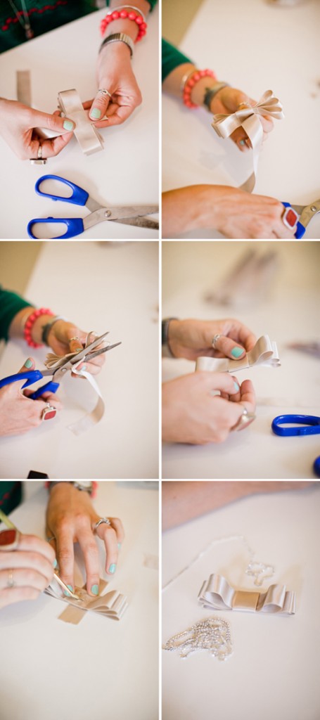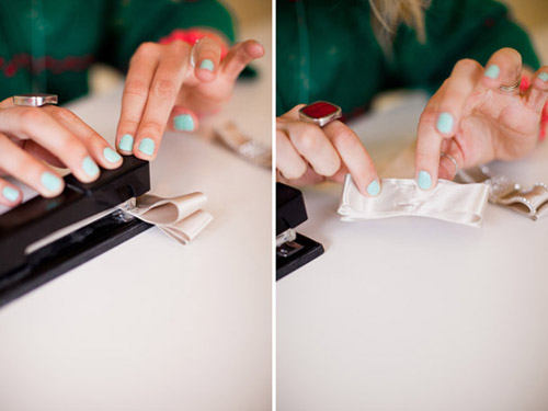 Bước 2: Sử dụng một đoạn ruy băng khác cuốn xung quanh phần trung tâm của chiếc nơ để che phần ghim rồi dùng keo đính chặt.