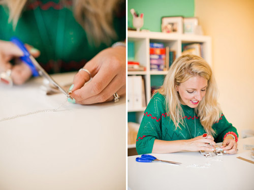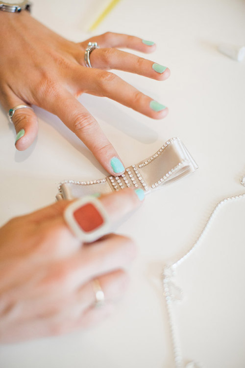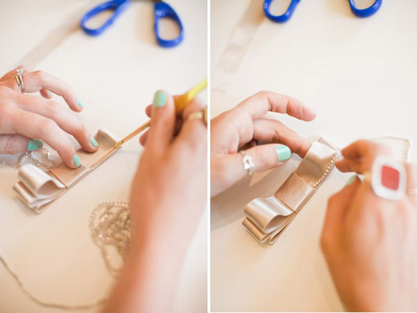 Bước 3: Dùng keo dán để đính dây đá lên nơ. Bạn có thể sử dụng những viên đá to hơn ở phần trung tâm để tăng hiệu ứng lấp lánh.