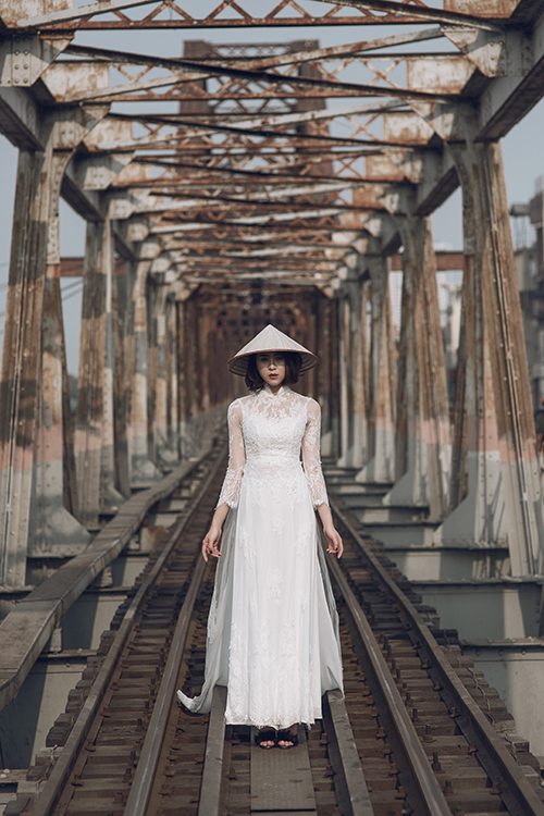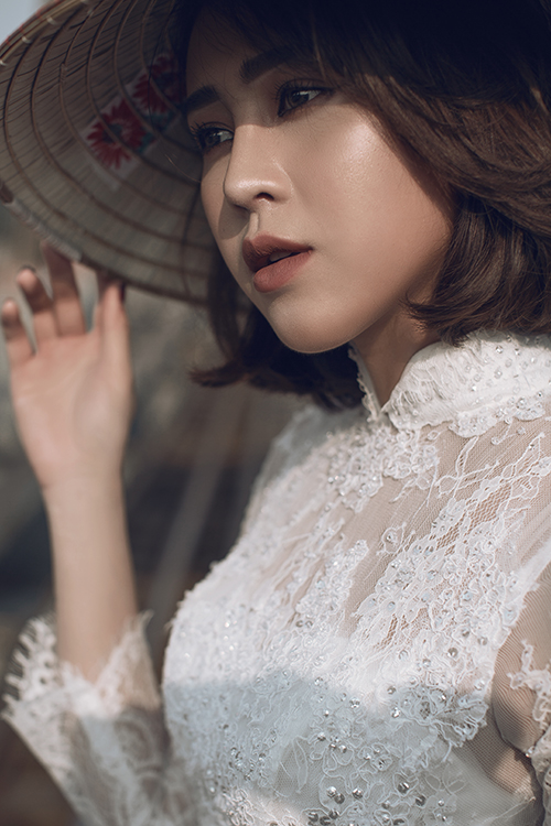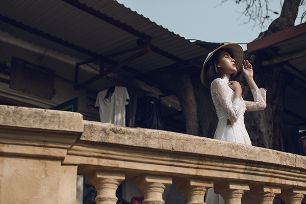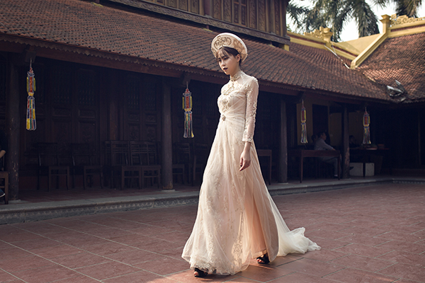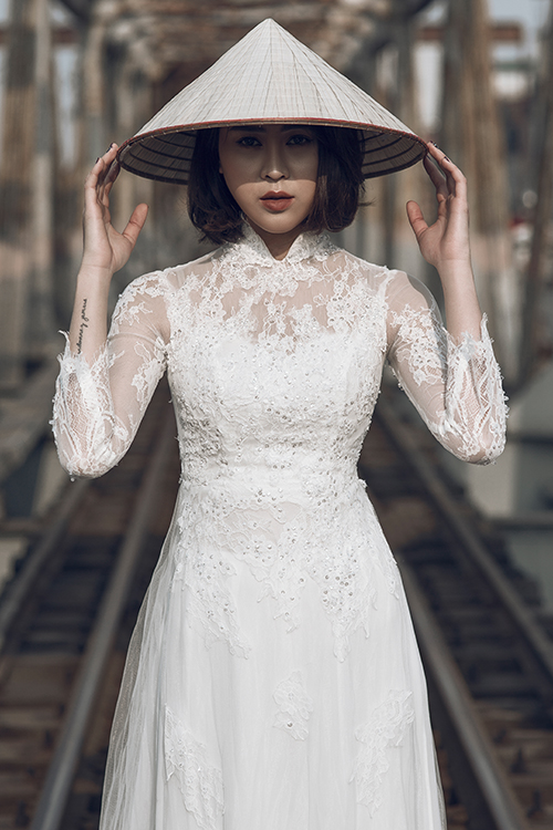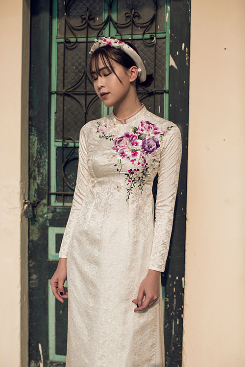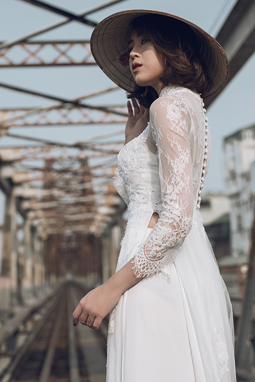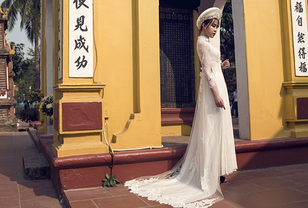 Nữ người mẫu kín đáo, e ấp mà bay bổng khi khoác lên mình mẫu áo dài chất liệu mỏng nhẹ, bay bổng. Áo dài cưới màu trắng nhẹ nhàng nhưng cũng không kém phần sang trọng vì cách đính kết điệu đà.