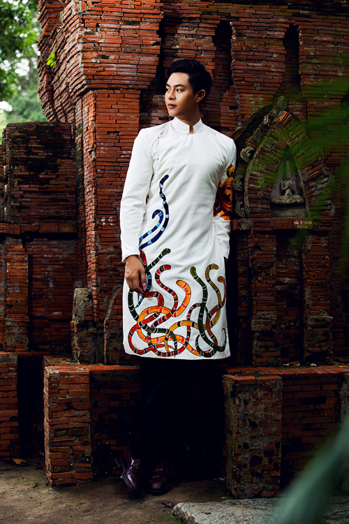 Để chăm chút cho trang phục ngày trọng đại của chú rể, nhà thiết kế chọn cách trang trí bằng họa tiết sang trọng. Tân lang có thể kết hợp áo dài cưới cách tân với quần jeans hoặc quần kaki ống đứng năng động.
