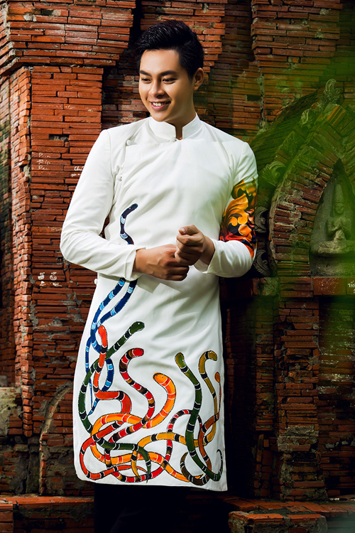 Siêu mẫu Ngọc Thiết, người từng đoạt giải Tài năng tại cuộc thi Siêu mẫu 2010 gợi ý những mẫu áo dài mới nhất cho tân lang cho mùa cưới 2017.