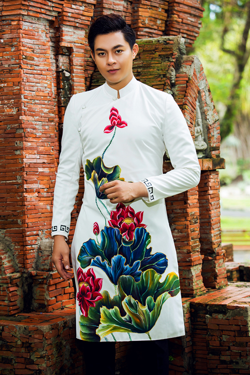 Bên cạnh các kiểu áo được thiết kế trên chất liệu vải lụa đơn sắc hay vải gấm, trang phục cưới cho phái mạnh còn được trang trí một cách cầu kỳ bằng họa tiết vẽ thủ công trên chất liệu cứng cáp.