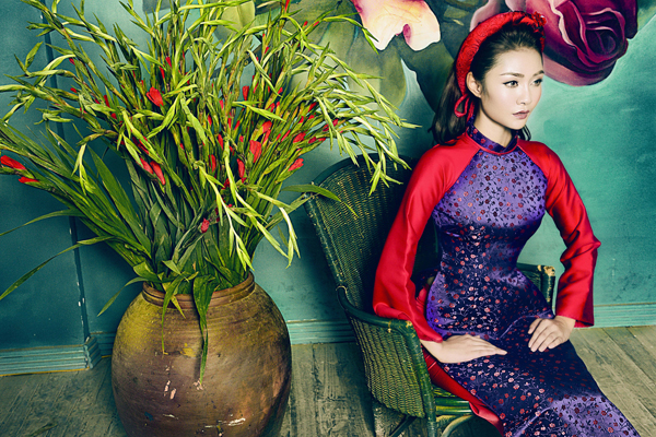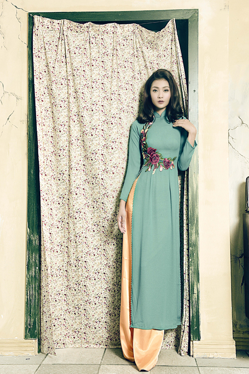 Ngoài cách chọn chất liệu sang trọng, những mẫu áo dài gấm trong bộ ảnh còn gây ấn tượng khi kết hợp với quần màu sắc nổi bật.