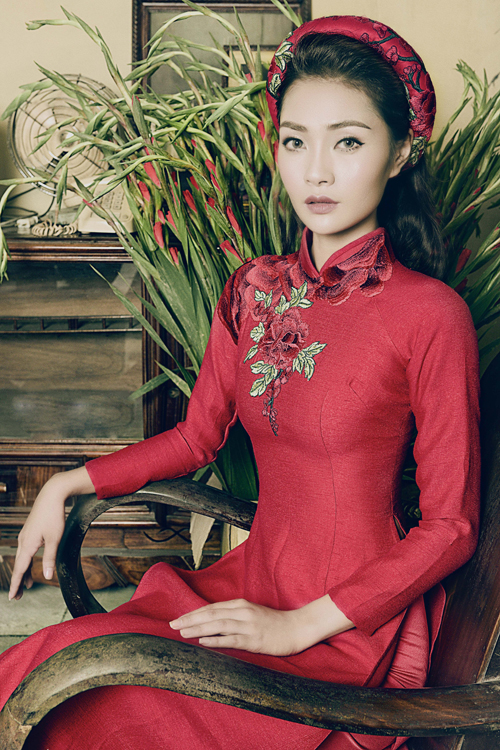 Vải gấm cứng cáp, đứng dáng, lại có hoa văn đẹp, nên không cần trang trí quá nhiều phụ kiện cầu kỳ.