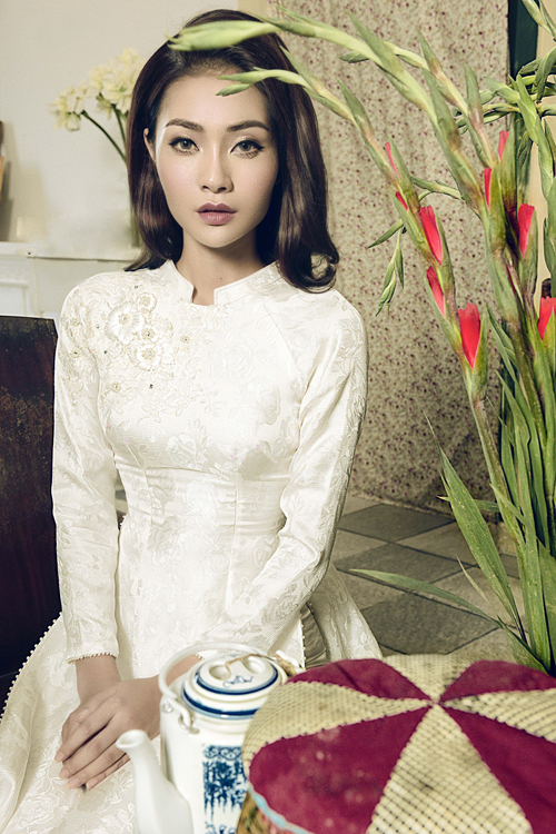Bên cạnh màu đỏ truyền thống, áo dài màu trắng được các cô dâu lựa chọn nhiều trong ngày cưới. Chiếc áo dài lụa trắng mang vẻ đẹp thanh lịch, trang nhã, tôn lên đường cong cơ thể.