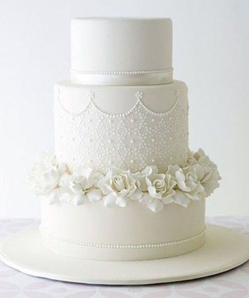 Bánh cưới white on white (họa tiết màu trắng nên nền màu trắng) không còn xa lạ với các cô dâu chú rể. Đây là lựa chọn phổ biến dành cho các đám cưới theo phong cách thanh lịch, sang trọng. Theo đó, toàn bộ lớp kem bao phủ phần cốt bánh và các họa tiết trang trí đều có màu trắng. Với bánh white on white, các nghệ nhân thường dùng lớp phủ bằng đường fondant để có bề mặt láng mịn và bóng mờ. Ngoài ra, các họa tiết trang trí cũng được làm từ nguyên liệu này để tạo sự đồng điệu.