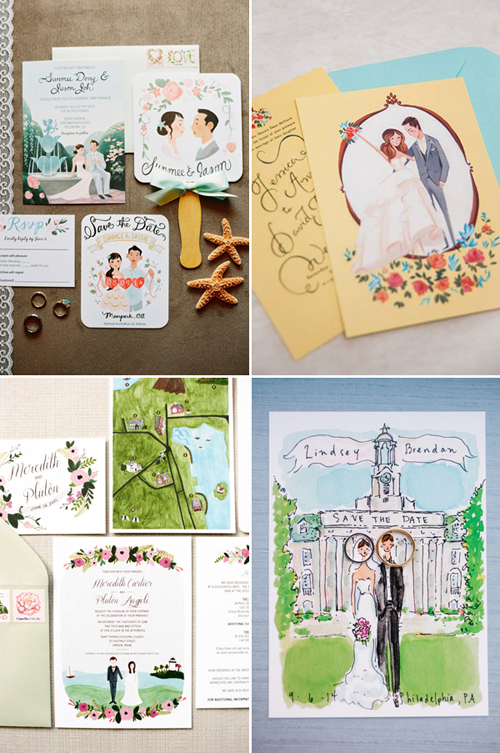Thiệp với hình vẽ hoạt hình hay biếm họa luôn khiến khách mời chú ý bởi vẻ độc đáo, vui nhộn. Đôi uyên ương có thể in lên thiệp hình vẽ chân dung của mình, hoặc sử dụng các hình ảnh đáng yêu, các nhân vật hoạt hình để trang trí cho tấm thiệp mời.
