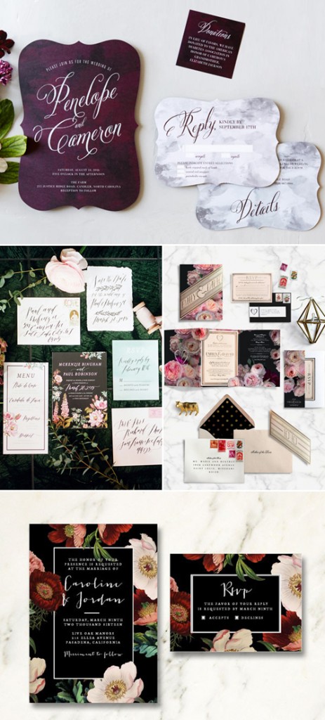 Khác với các mẫu thiệp mời có tông màu sáng đơn điệu thường thấy, mùa cưới 2016 là sự lên ngôi của thiệp cưới với gam tối như màu mận, nâu, đỏ sẫm, xanh lá đậm, đen... Thiệp tối màu cũng thể hiện cá tính mạnh mẽ của cô dâu chú rể.