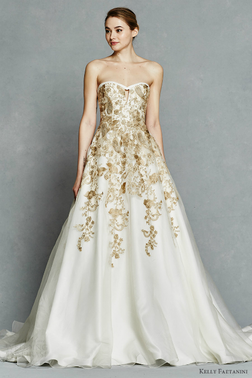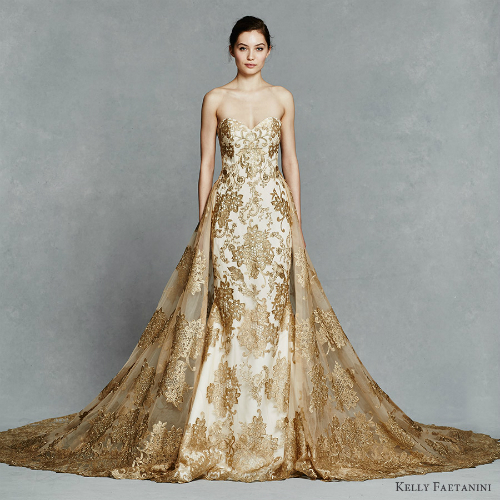 Hoa văn thêu ren ánh vàng luôn mang lại sự sang trọng cho người mặc, đặc biệt là khi được điểm trên nền trắng của váy cưới. Những thiết kế này tạo hiệu ứng bắt sáng, phù hợp với đám cưới tổ chức trong nhà với ánh sáng mạnh.