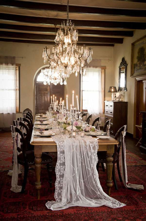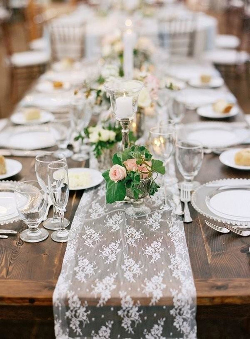 Nếu bạn đang có ý định tổ chức đám cưới theo phong cách vintage, hãy trải những chiếc khăn ren trên bàn gỗ. Cách kết hợp này mang đến sự lãng mạn ngọt ngào cho đám cưới theo phong cách vintage. Với sự kết hợp này, bạn không cần đặt nhiều đồ vật trang trí trên bàn tiệc của mình nữa. Những cây nến sẽ làm tăng thêm vẻ cổ điển mềm mại của chiếc khăn ren.