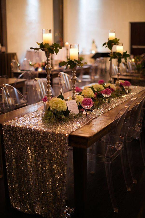 Khăn trải bàn sequin lấp lánh phù hợp với những đám cưới sang trọng và lộng lẫy. Sequin vốn đã bắt mắt, vì vậy bạn nên chọn hoa trang trí có màu sắc nhẹ nhàng, trang nhã. Bạn có thể chuẩn bị khăn hoặc giấy ăn có màu xanh ngọc lục bảo trên bàn để tăng thêm vẻ vương giả cho bữa tiệc của mình.
