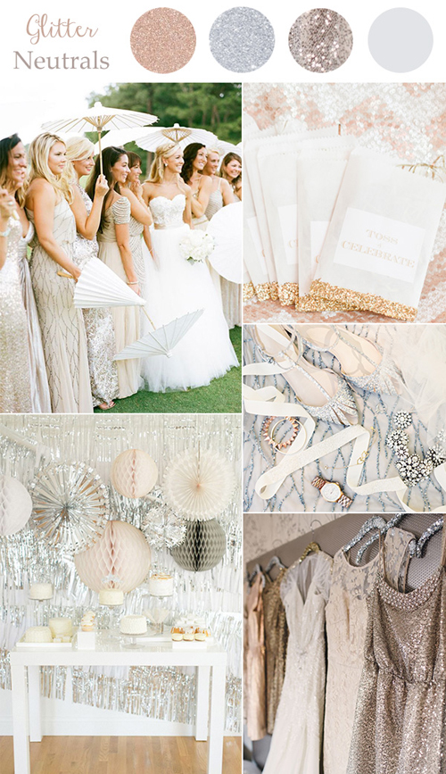 Các màu sắc lấp lánh, có nhũ kim tuyến ngày càng được các cặp đôi ưa thích. Phong cách này thích hợp với những đám cưới sôi động, hào nhoáng đậm chất tiệc tùng. Kết hợp màu ánh kim với các màu trung tính sẽ tạo nên tổng thể hài hòa, khiến bữa tiệc không bị rối mắt vì quá nhiều chi tiết lấp lánh.