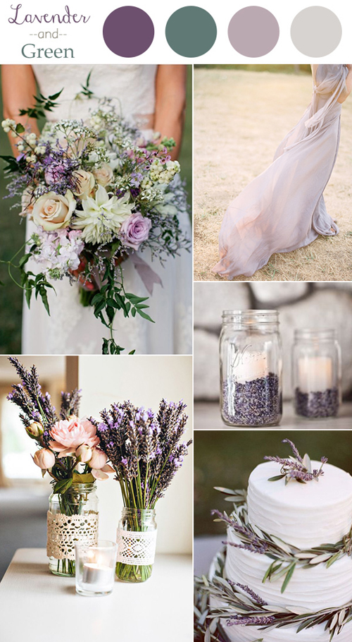 Màu tím oải hương và xanh lá cây là gợi ý dành cho những cô dâu ưa phong cách nhẹ nhàng. Sắc tím nhạt của hoa oải hương mang ý nghĩa về sự chung thủy. Ngoài ra, màu sắc này còn phù hợp với phong cách trẻ trung, lãng mạn. Kết hợp với màu xanh đậm của cỏ cây sẽ làm màu tím này trông có sức sống hơn. Bên cạnh những bông hoa oải hương tươi hoặc khô, cô dâu chú rể còn có thể áp dụng màu tím cho váy phù dâu, dải lụa trang trí hoặc bánh cưới…