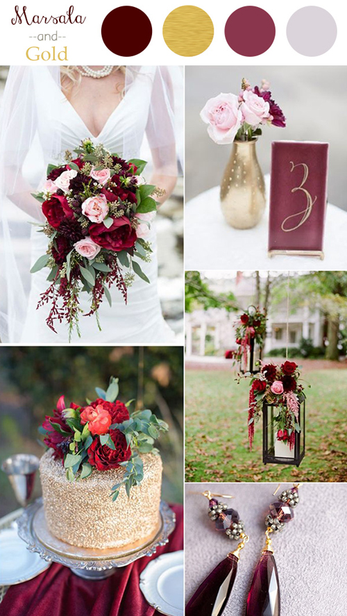 Màu đỏ rượu được Viện màu sắc Pantone bình chọn là gam màu của năm 2015. Năm 2016, gam màu này tiếp tục được nhiều cô dâu chú rể yêu thích trong trang trí đám cưới với nhiều phong cách khác nhau. Khi kết hợp nâu đỏ với vàng ánh kim để trang trí, không gian tiệc cưới trông sẽ ấm áp, sang trọng và hào nhoáng hơn. Sự kết hợp này thường được áp dụng cho mùa thu đông.