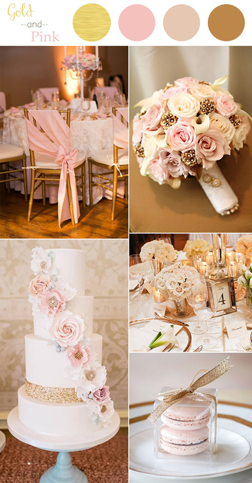 Màu hồng thường được các cô gái yêu thích bởi vẻ đáng yêu, dịu dàng và lãng mạn. Màu sắc này cũng tượng trưng cho sự ngọt ngào trong tình yêu nên được sử dụng nhiều trong đám cưới. Để tăng tính sang trọng, nhiều chuyên gia trang trí tiệc cưới kết hợp màu hồng với màu vàng ánh kim. Theo đó, những bông hoa bằng kim loại phun sơn vàng đính trang sức sẽ được điểm xuyết cùng hoa tươi màu hồng pastel hoặc chiếc ghế sơn màu vàng đồng được làm điệu bằng dải nơ bằng lụa hồng…