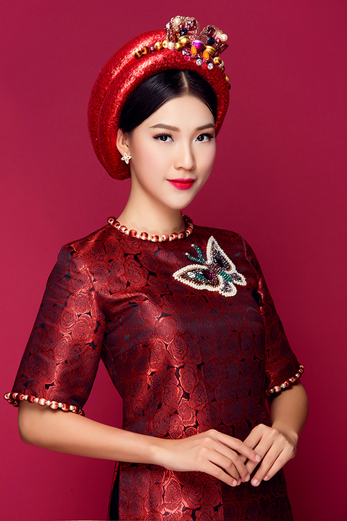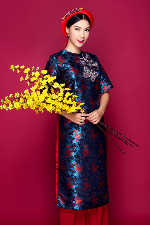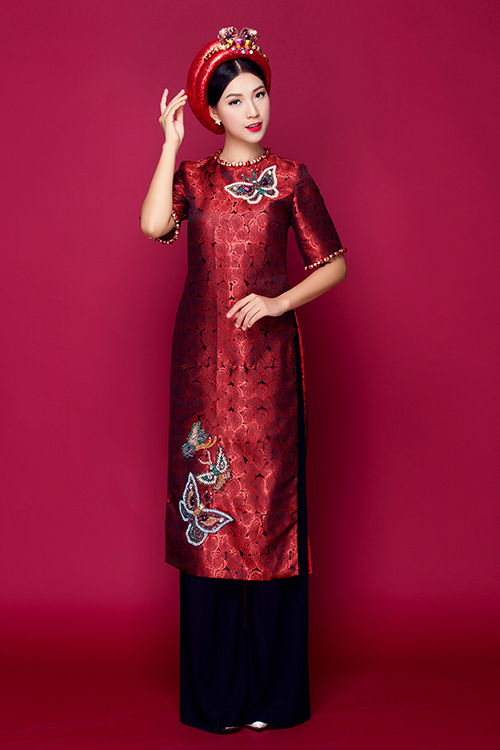Kỹ thuật thêu 3D trên nền vải gấm khá phức tạp vì mặt vải dễ bị xước, nhăn nhúm. Phom áo dài không gò bó với cảm hứng từ thời trang những năm 70.