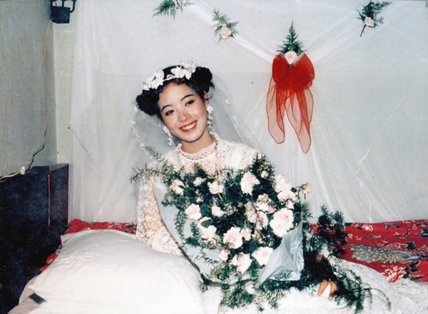 Diva Thanh Lam lên xe hoa năm 18 tuổi. Trong ngày cưới, nữ ca sĩ xuất hiện nhẹ nhàng với mẫu váy cưới ren trắng cùng kiểu tóc ngang vai quen thuộc. Găng tay trắng được các cô dâu xưa coi như món phụ kiện không thể thiếu trong ngày trọng đại. Tuy nhiên, cuộc hôn nhân này chỉ kéo dài trong một thời gian ngắn. Nhiều năm sau, Thanh Lam bén duyên với nhạc sĩ Quốc Trung.