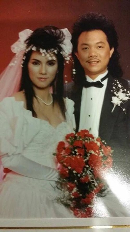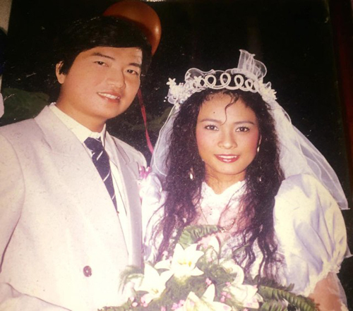 Bức ảnh cưới hiếm hoi của vợ chồng nghệ sĩ Xuân Hinh được chụp vào năm 1993. Trong đám cưới, Xuân Hinh đi đón dâu bằng xe Dream. Vợ nghệ sĩ diện bộ váy cưới tay bồng cổ điển cùng chiếc vòng cổ bằng nhựa được đính kết hạt thủ công.