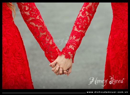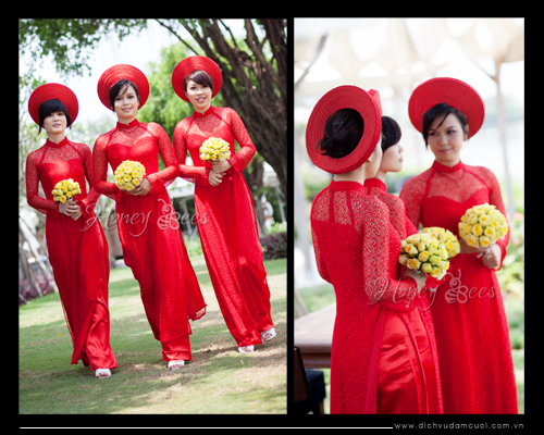 Đến với Honey Bees, bạn còn được tư vấn về cách phối áo dài sao cho phù hợp. Thông thường với các cô dâu chọn cho mình áo dài màu đỏ thì rất dễ để phối cho mình các màu sắc đi cùng tông hoặc khác tông hoàn toàn như: