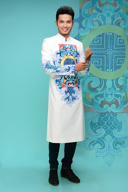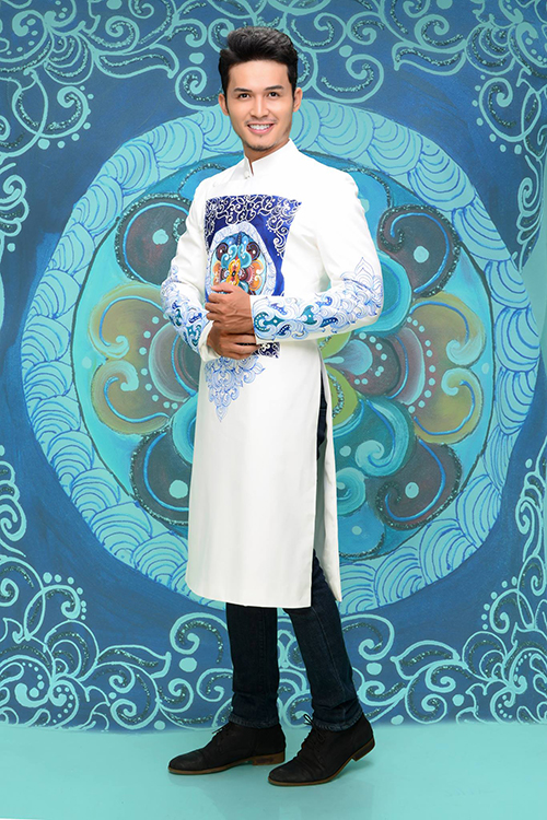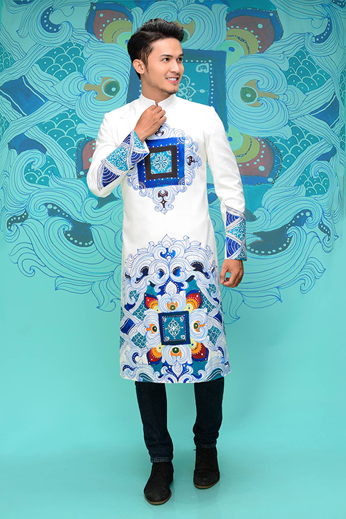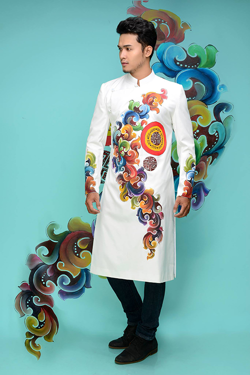 Để chăm chút cho trang phục ngày trọng đại của chú rể, nhà thiết kế chọn cách trang trí bằng họa tiết sang trọng. Tân lang có thể kết hợp áo dài cưới cách tân với quần jeans hoặc quần kaki ống đứng năng động.