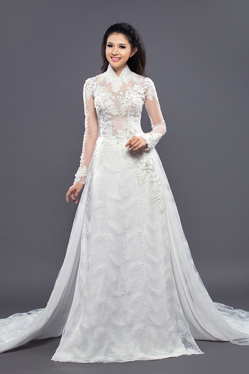 Mẫu áo dài cưới độc đáo với họa tiết ren đối xứng trang trí khắp thân và tà áo. Chiếc áo được đính ren và đá ánh kim lấp lánh, lấy cảm hứng từ trang phục của hoàng tộc xưa. Ngoài ra, tà áo dài vừa chấm đất giúp cô dâu dễ dàng khi di chuyển.