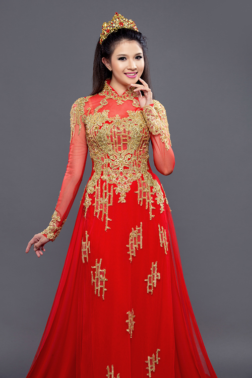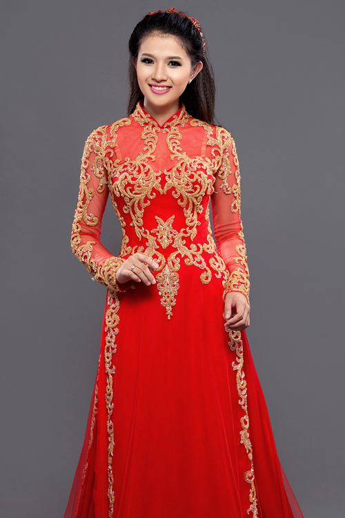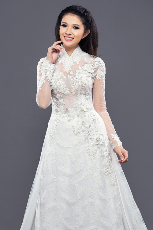 Với chất liệu chủ yếu từ lưới voan và ren, áo dài cách tân mang dáng dấp gần giống như một chiếc váy dạ hội quyến rũ mà không mất đi vẻ trang trọng truyền thống.