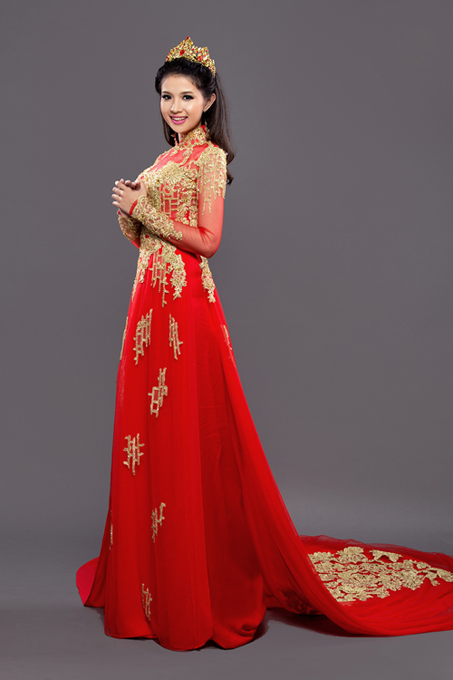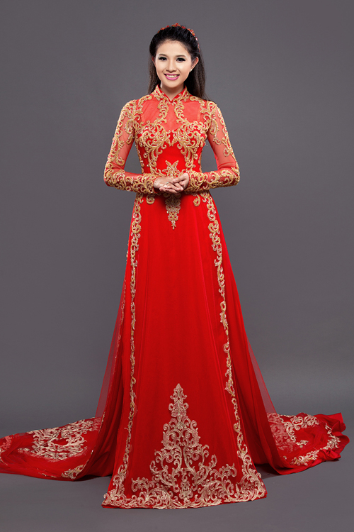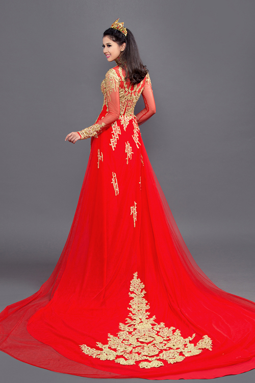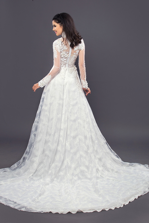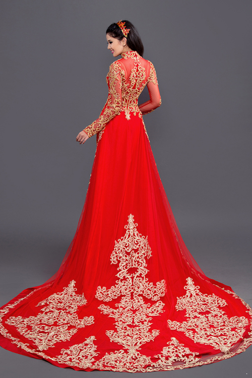 Không chỉ thân trước, lưng áo cũng được trang trí họa tiết cầu kỳ. Đuôi áo dài thướt tha như một chiếc váy cưới mang đến sự thướt tha, lộng lẫy.