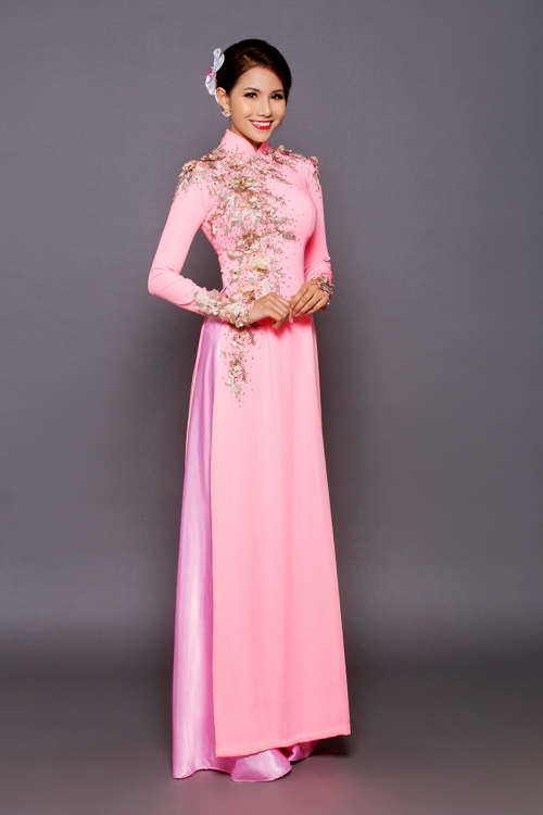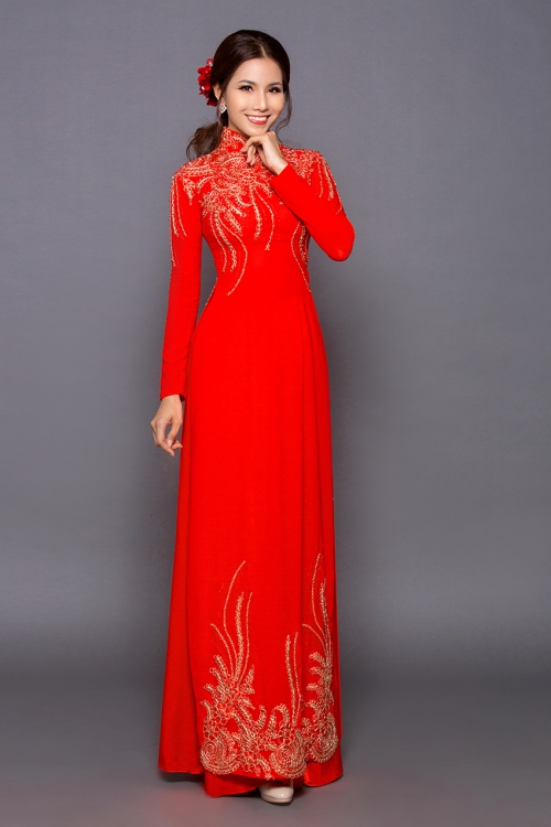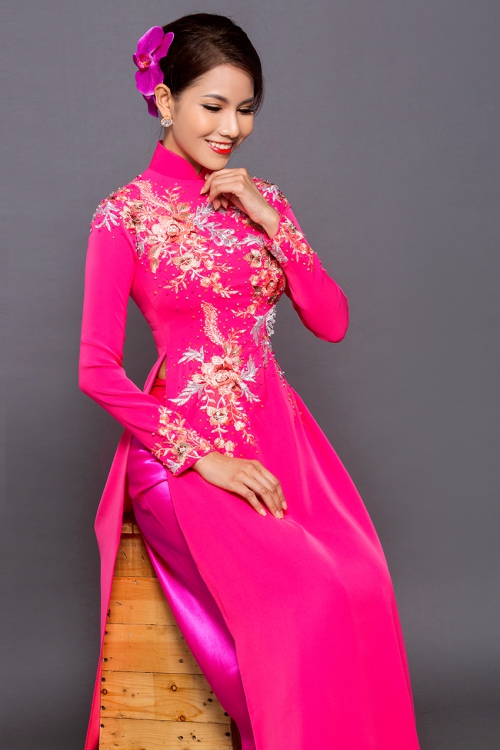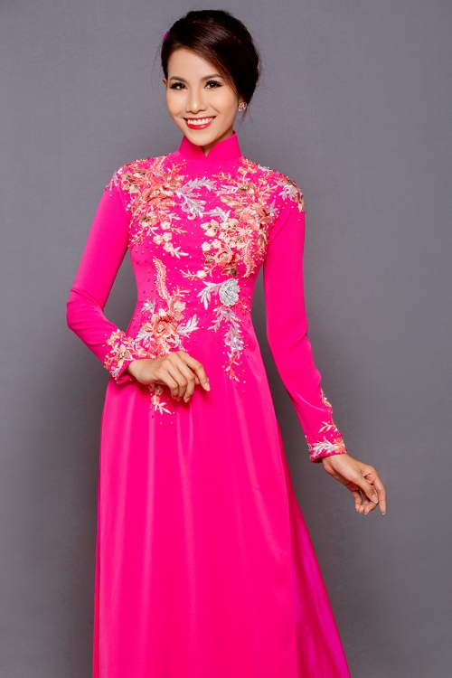 Áo dài hồng đậm được yêu thích trong đám cưới, giúp tôn nét nữ tính, lãng mạn cho tân nương. Cổ cao truyền thống được viền đá pha lê làm khuôn mặt thêm tươi sáng, rạng rỡ.