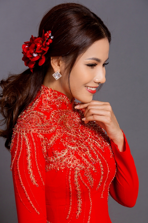 Nhà thiết kế chọn ren và đá đỏ cùng màu áo dài để trang trí thân áo giúp thiết kế đồng điệu, hài hòa về màu sắc.